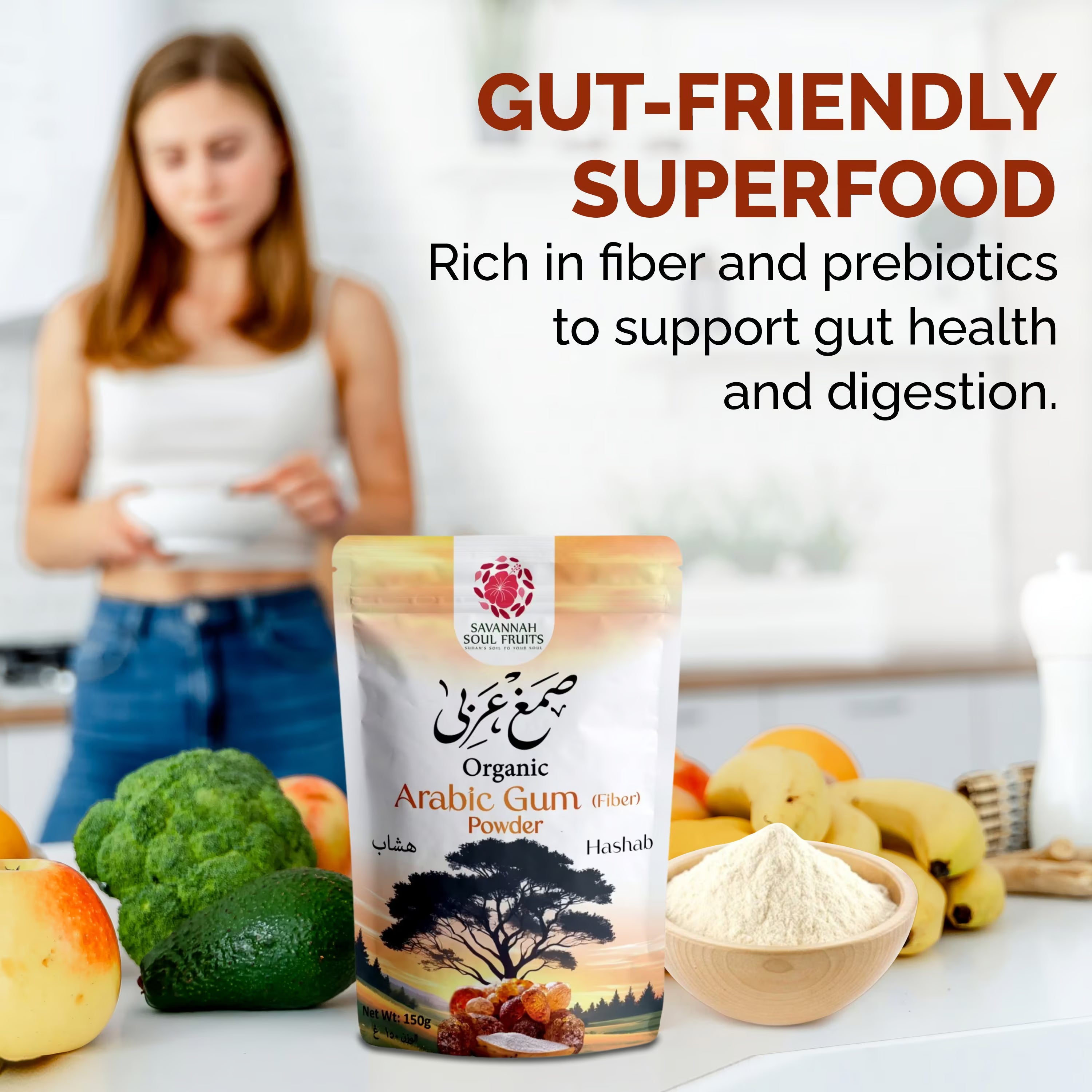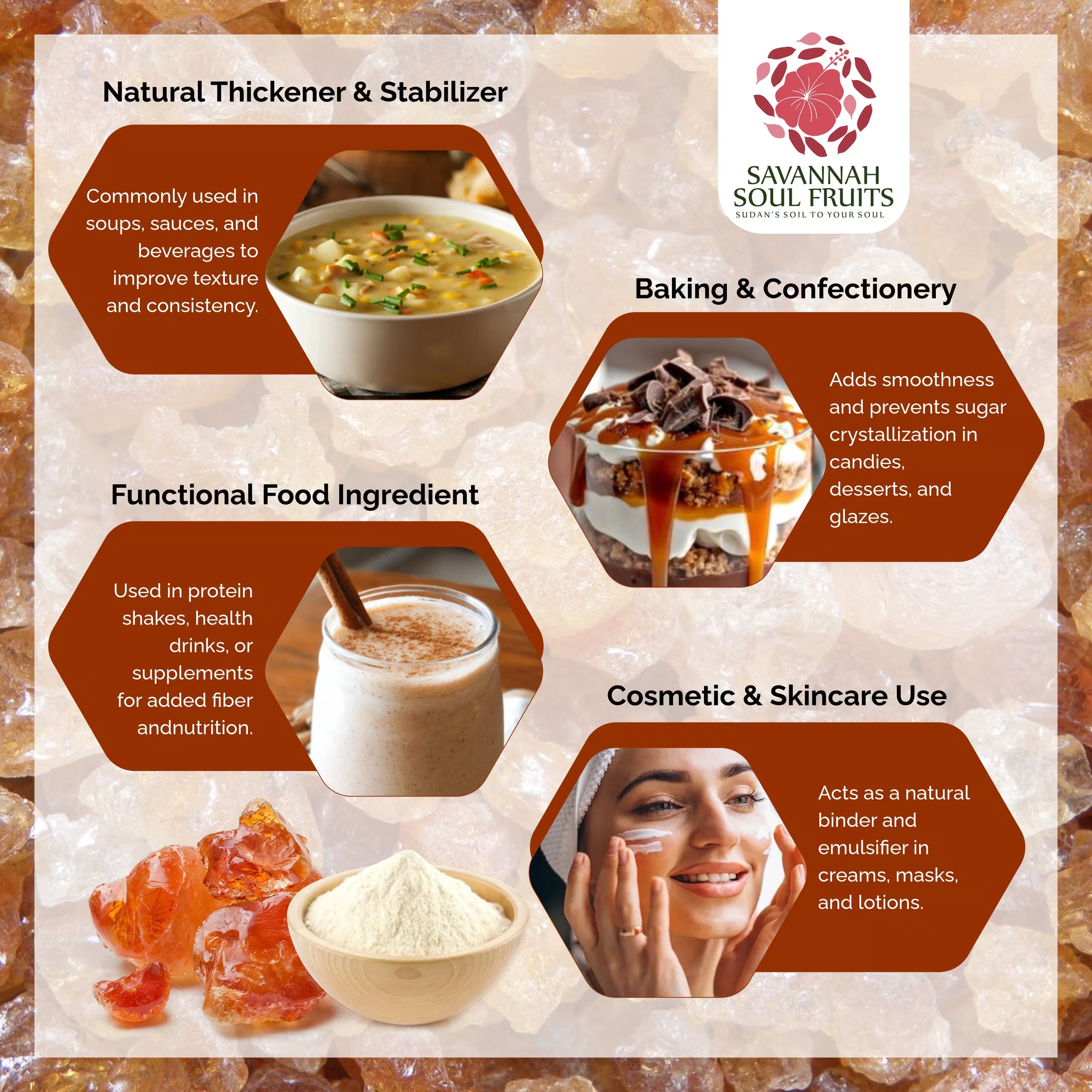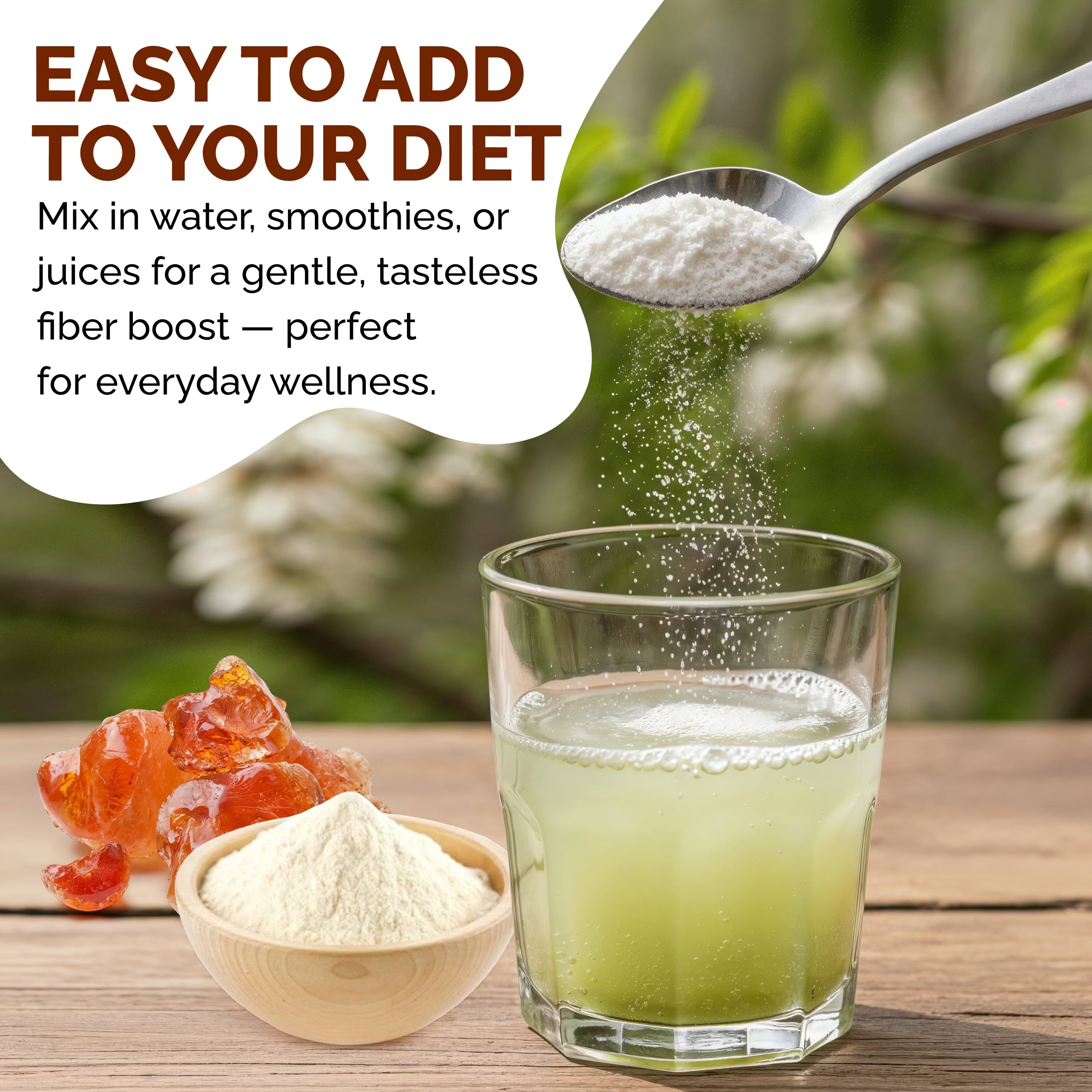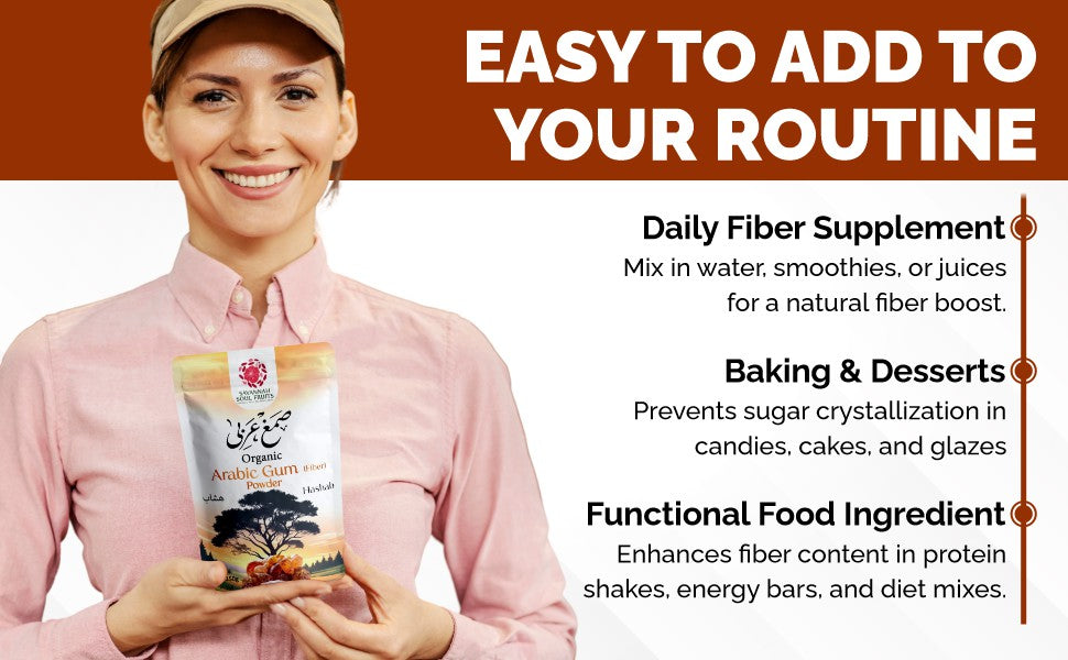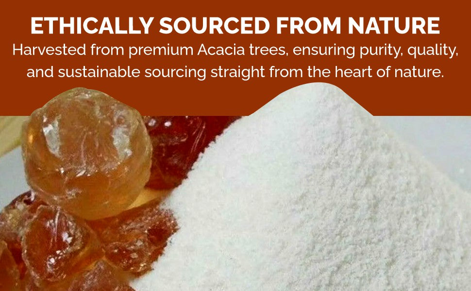 "Unlock nature's goodness with our premium Arabic Gum Powder! Packed with soluble fiber for digestive support and energy, it's a must-have for your daily wellness routine."