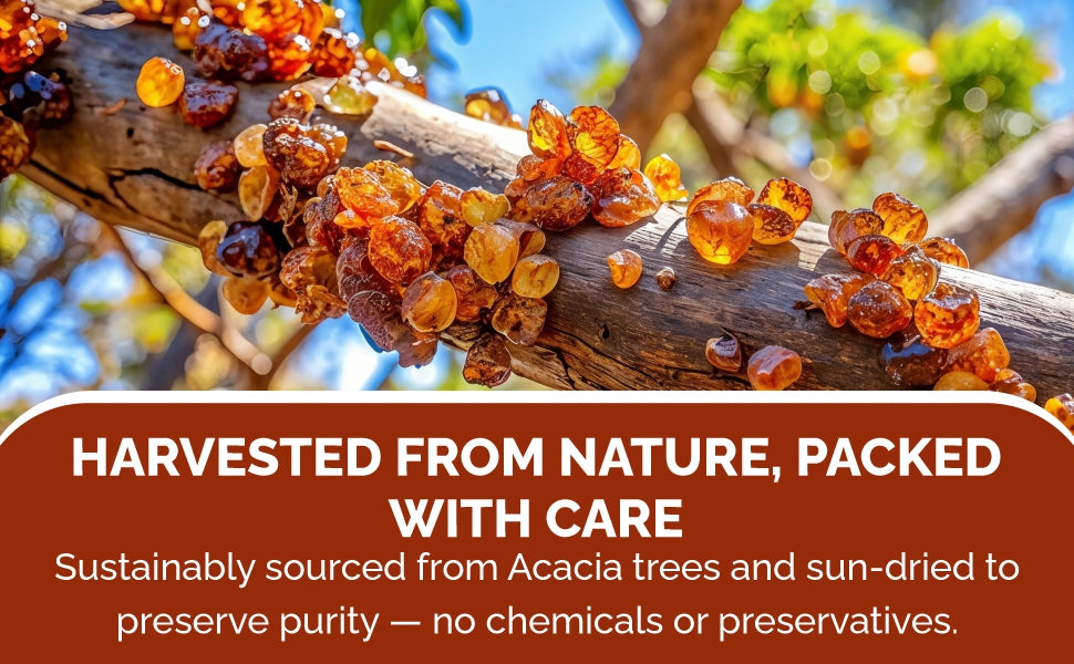 - 100% Natural & Pure Grade A Gum Arabic: Harvested from Acacia Senegal trees in Sudan, these translucent gum crystals are 100% natural, food-grade, and free from chemicals or preservatives. Known for their superior purity, solubility, and neutral taste ideal for everyday wellness and food use.